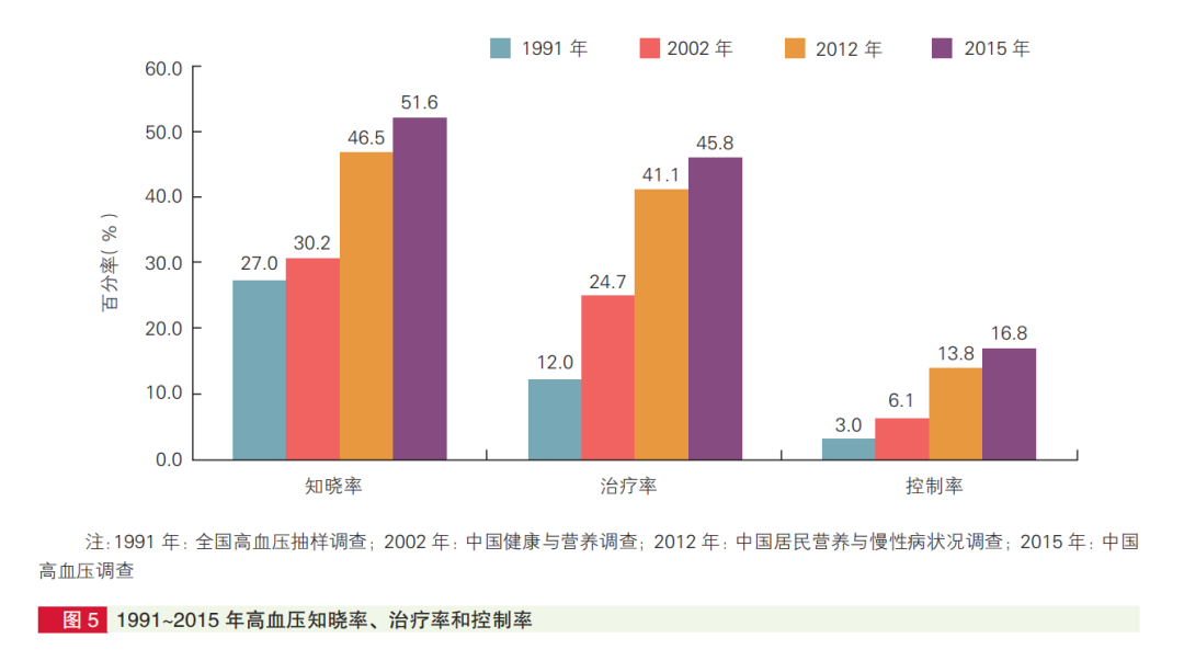 近年來,高血壓的知曉率、治療率和控制率呈現(xiàn)出持續(xù)增長趨勢。知曉率從1991年的27%升至2015年的51.6%,同期治療率從12.0%升至45.8%,控制率從3.0%升至16.8%。